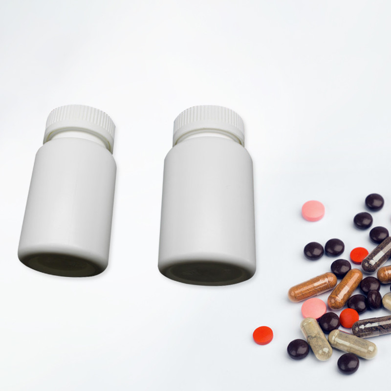 Biała, zamknięta, mała butelka na lekarstwa może być używana do pakowania produktów ochrony zdrowia, takich jak kapsułki i żywność.